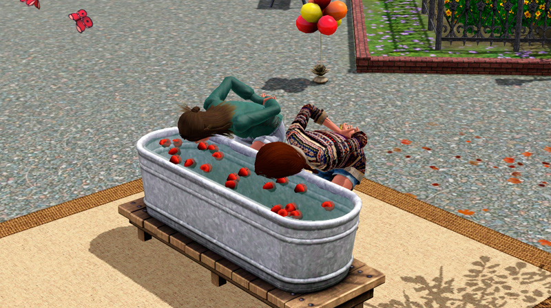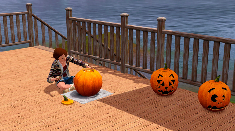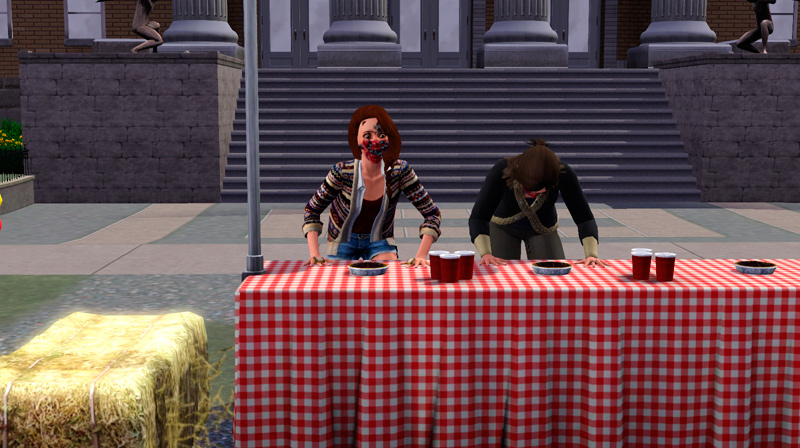 На осеннем празднике будет проходить соревнование, после которого вы узнаете (а может, и станете победителем) кто же быстрее всех ест пироги. Только имейте в виду, что ваш сим во время такого соревнования сильно испачкает лицо. Поэтому ему нужно будет срочно принять гигиенические процедуры. Правда, есть альтернатива – принять участие в соревновании по вылавливанию яблок. Вы тут можете удивиться и спросить: как это поможет отмыть лицо? Все очень просто! Яблоки нужно будет вылавливать из ванны с водой. И делают это ртом, без помощи рук.