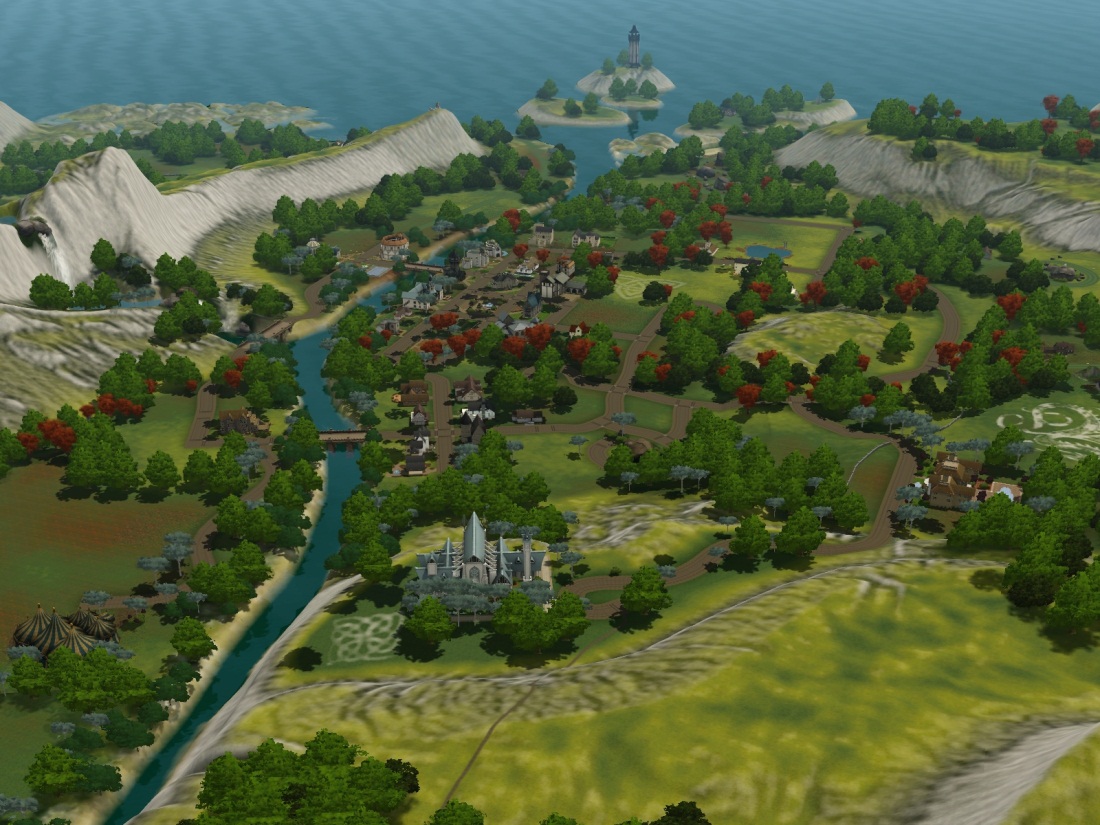 Я лично занимался разработкой рельефа для этого мира и должен заметить, что конечный результат нравится мне больше, чем все, что я делал в других городах нашей серии. Хотя у нас есть и довольно большие плоские участки, которые позволяют игроку размещать крупные участки, - все равно общий рельеф мира у нас очень разнообразный и причудливый. Высочайшая гора идеально вписывается в ландшафт, и ваш персонаж может при желании покорить эту вершину. По-моему, эта гора похожа на древнее обиталище дракона. У нас есть и крутые утесы, но берега рек и моря вполне пологи, и ваши персонажи могут при желании поплавать. Изначально наш мир был бело-зеленым, но потом разработчики добавили красного – и почве, и листве деревьев, и теперь мир стал еще более теплым и цветным. А еще мы добавили меловых скульптур, сделанных руками первобытных людей, чтобы придать миру исторической достоверности – от неолита до наших дней. Еще у нас в городе есть руины, оставшиеся с Темных веков – может быть, это остатки замков, давным-давно разрушенных драконами!