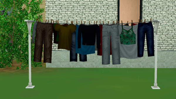 Но удовольствие от чистого белья вы не сможете получить, если белье будет сырым. Поэтому в вашем доме должна быть хотя бы бельевая веревка. Особенно она по нраву симам, у которых есть такая черта характера, как «Защитник природы», ведь не требуется на сушку затрат электроэнергии. Но будьте готовы к тому, что на бельевой веревке стираные вещи сушатся довольно долго. Еще и лужи под ней остаются.